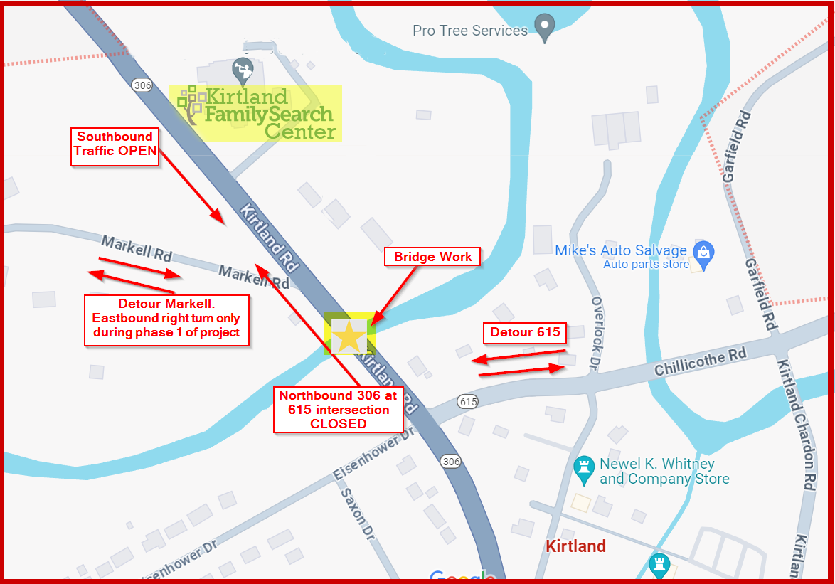 The bridge just south of the Kirtland FamilySearch Center on State Routh 306 will be under construction beginning Monday, March 18th, lasting through October 2024.