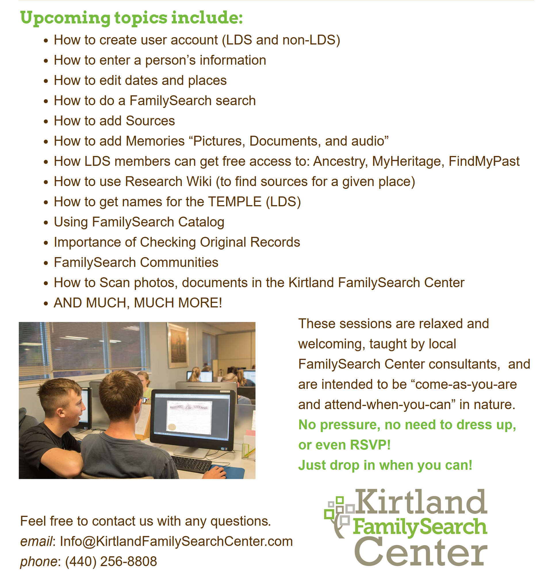 The Kirtland FamilySearch center is excited to announce that we are offering weekly informational learning sessions to help you get started or enhance your use and understanding of the awesome research features and benefits available at familysearch.org